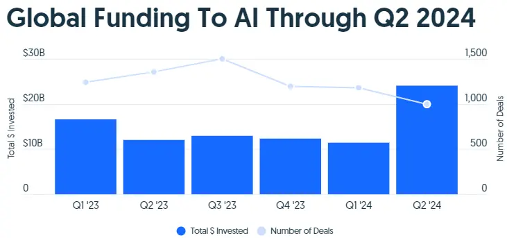‘24년 상반기 글로벌 AI 스타트업에 355억달러(49조원) 이상이 투자되었으며, 2분기 전체 스타트업 투자 790억달러(100조원) 중 AI 분야 240억달러(26조원), 헬스케어/바이오테크가 170억달러(24조원), HW 분야 110억달러(15조원, AI 인프라 및 반도체 자금)를 기록했다.